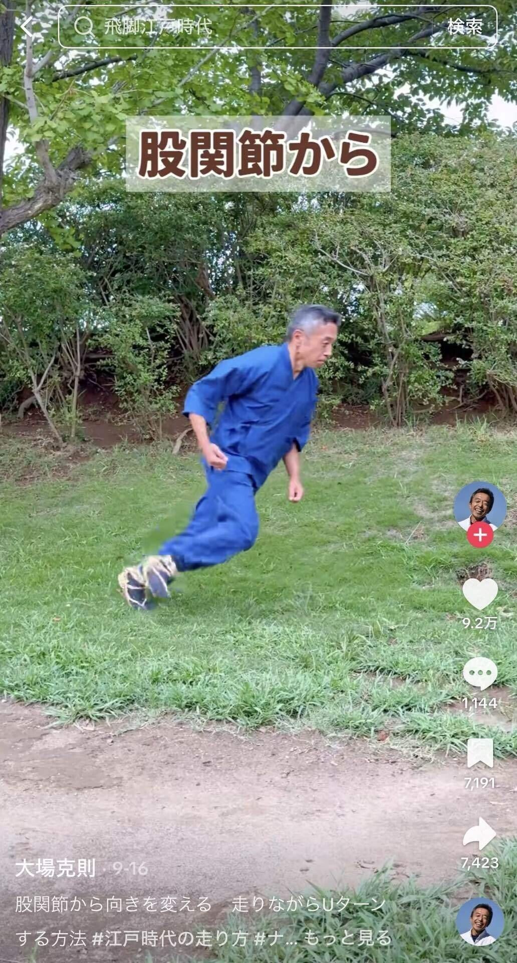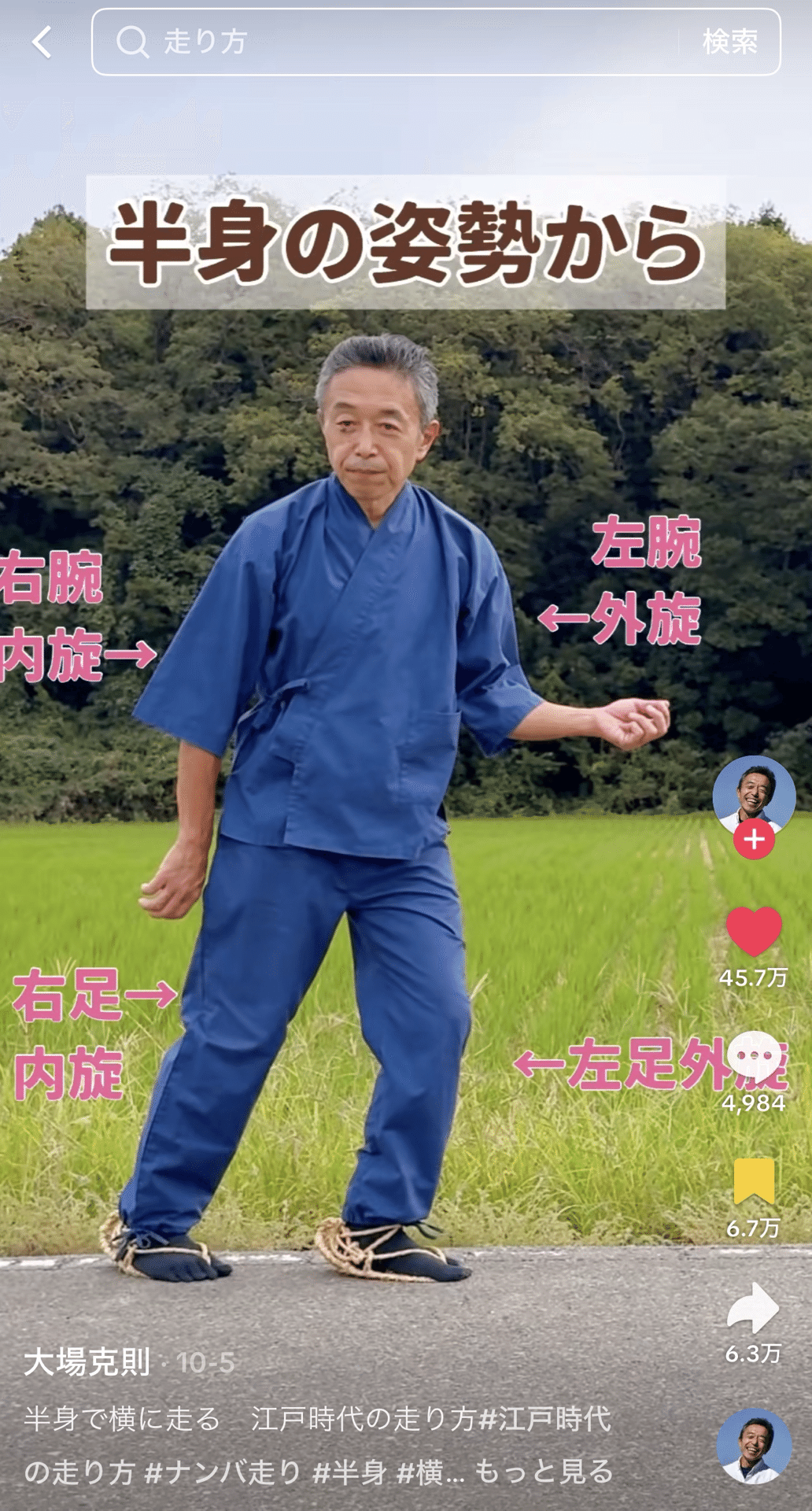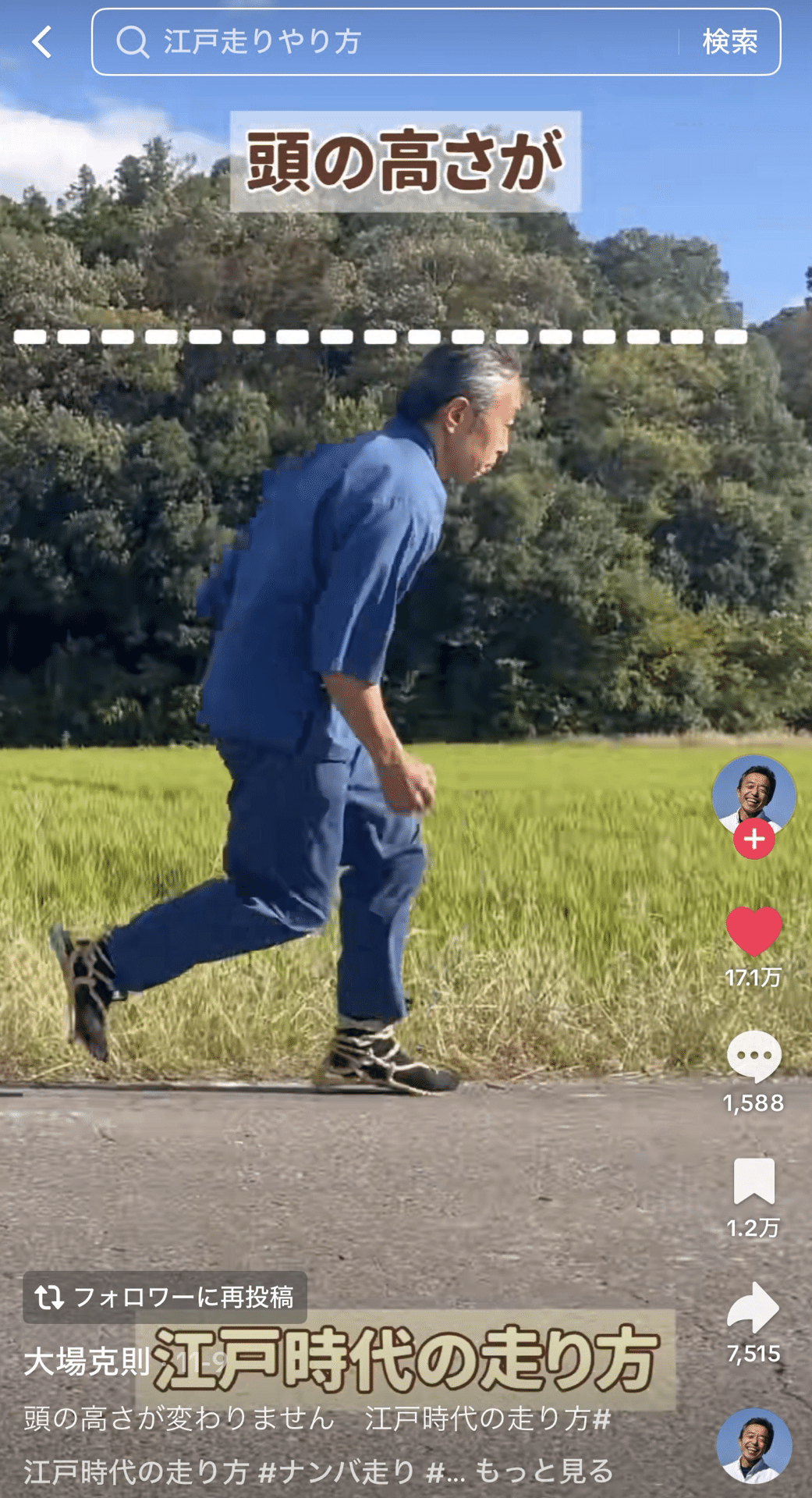 このトレンドの生みの親は江戸時代の走り方を10年間研究する大場克則さん。この動画だけでも1500万再生を記録しています。