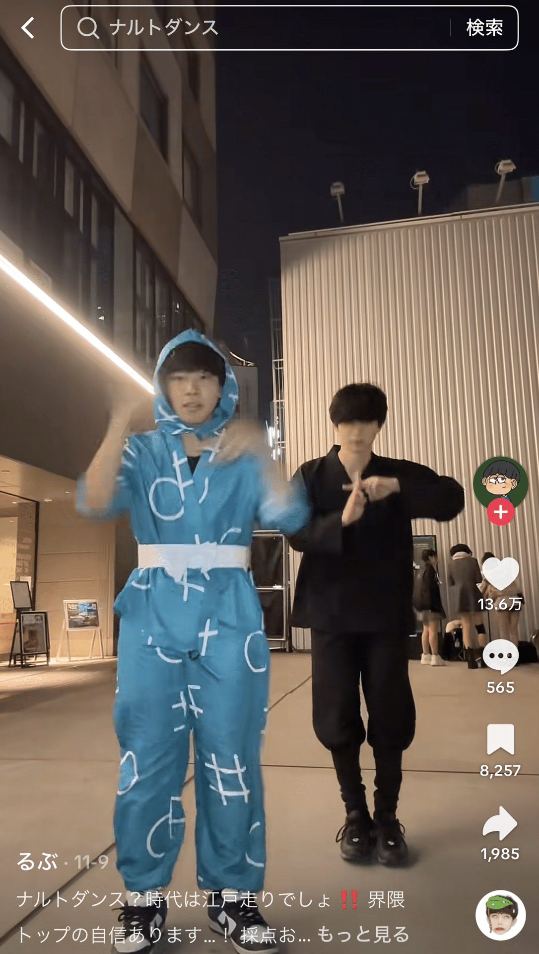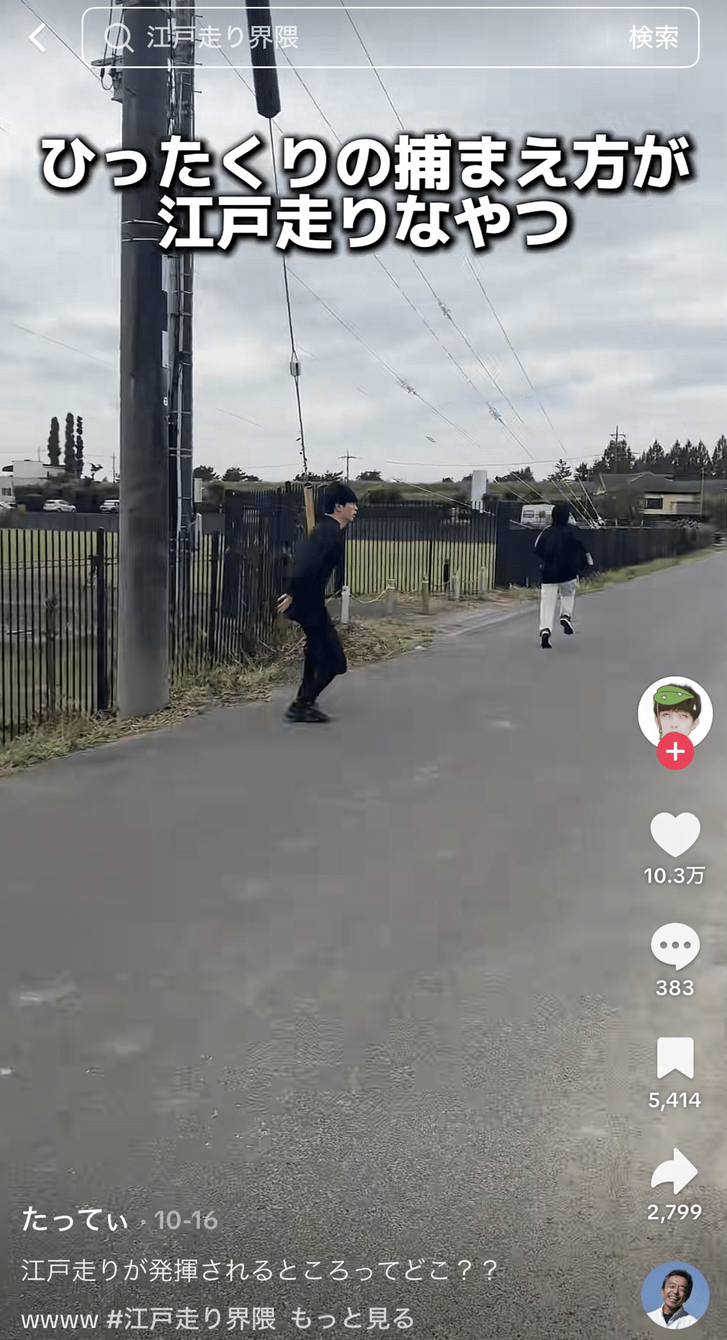 さらには、大きなトレンドとなったナルトダンスをやると思いきやの江戸走りを行うといったフォーマットの動画も流行っています。(画像内にリンクを埋め込んでいるのでご覧ください)
