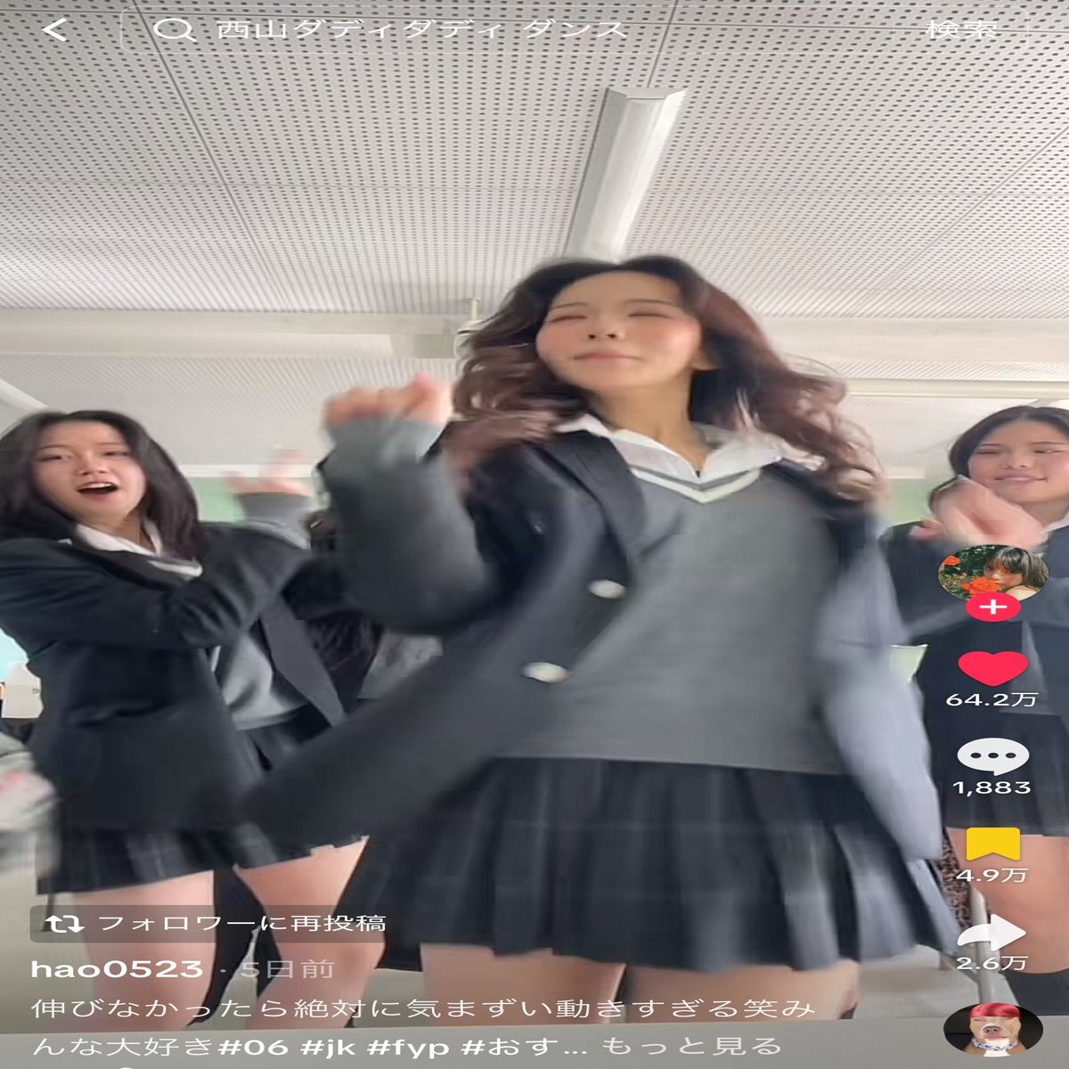 比較的にこの西山ダディダディは高校生たちがノリで「あれやろうよ」となりやすいコンテンツです。なぜなら一定のリズム感で適当にやっても問題なし、カメラは固定で撮影できる、複数人でわちゃわちゃできるという3拍子が揃っているからです。
