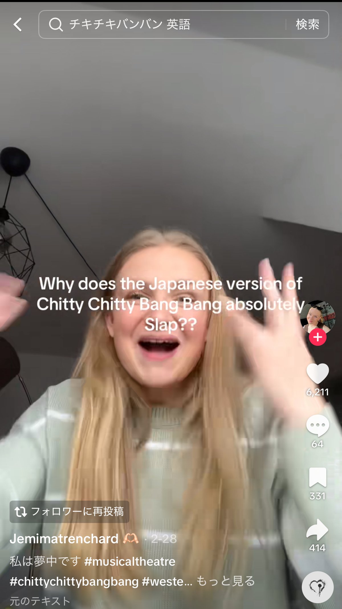 チキチキバンバンは1968年につくられたイギリスのミュージカル映画の車の名称として登場し、その後に日本語バージョンが作られ、合唱曲として知られています。この日本語のアクセントがクセになるらしく海外でバズっています。https://vt.tiktok.com/ZSrdMDrRC/