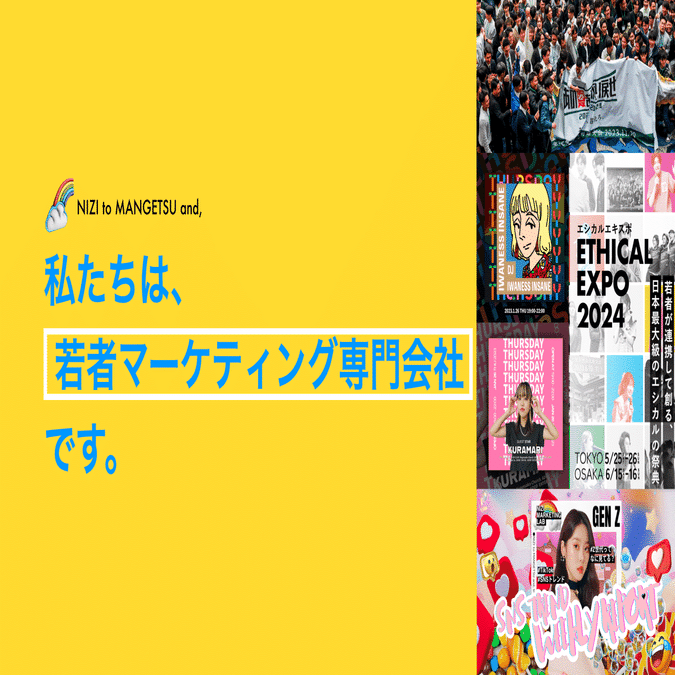 虹と満月と株式会社は、若者マーケティング専門会社です。Z世代1.5万人を動員したオフラインイベント、100万再生連発のショート動画制作、自社ブランド、ナイトタイムエコノミーコンテンツ制作など、Z世代を軸に幅広く事業を展開しています。「イケてるメンツたちとイケてるクリエイティブで地球を沸かせる」をビジョンに、大企業から自治体、大学、スタートアップまで幅広く支援しています。