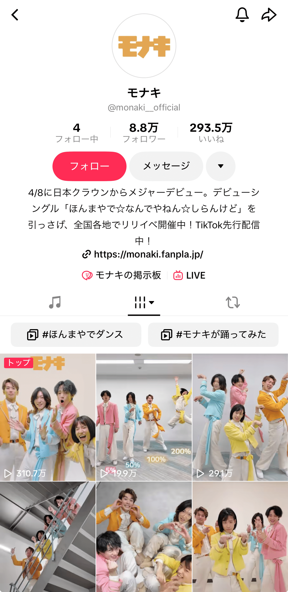 今最もバズっている4人組で、直近の動画では100万再生も連発しています。