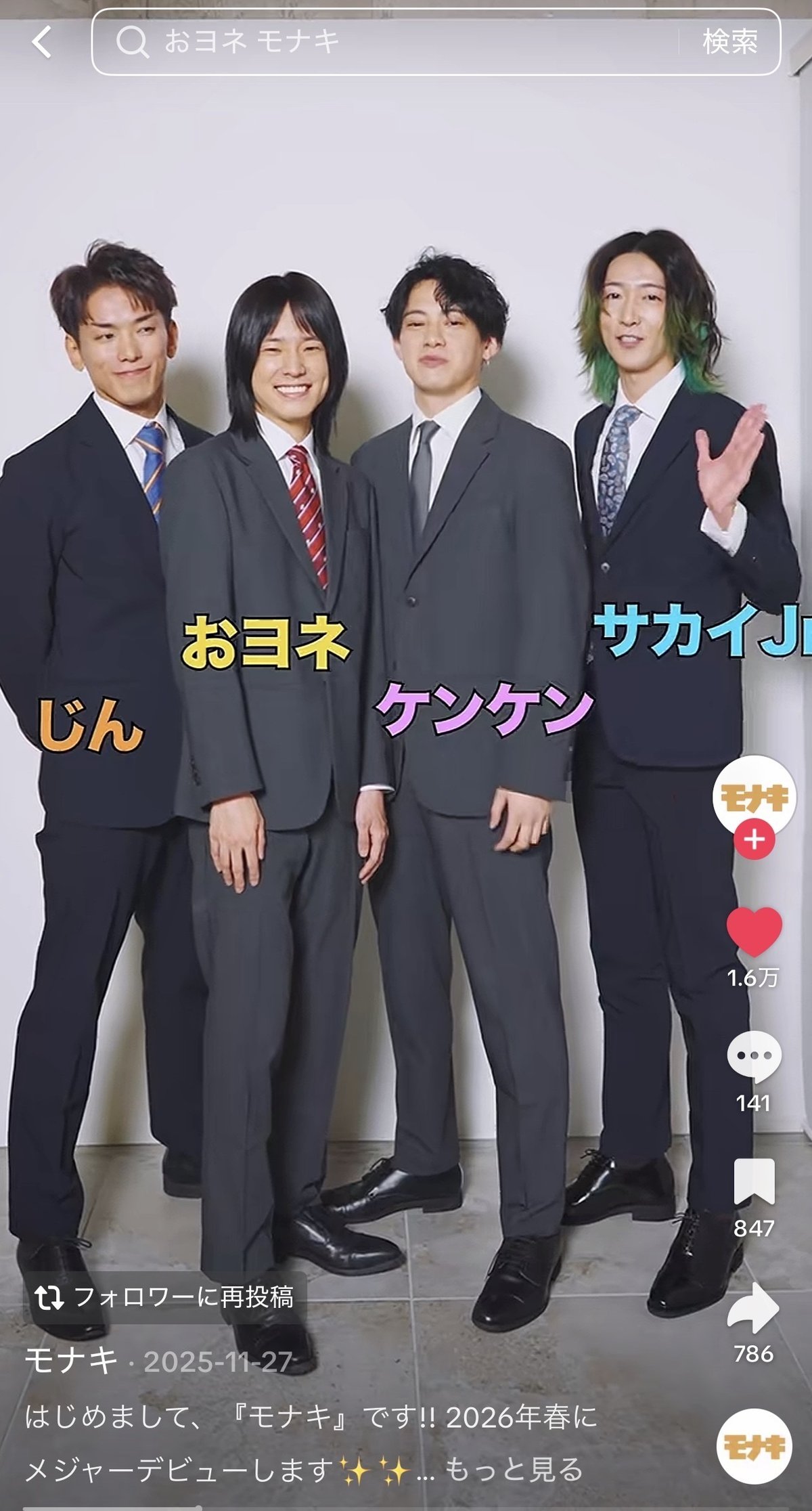 モナキとは、純烈のリーダー・酒井一圭がプロデューサーを務める弟分グループで、2026年4月8日にメジャーデビューする4人組男性グループです。モナキという名前は「名もなき者たち」が由来となっているようです。