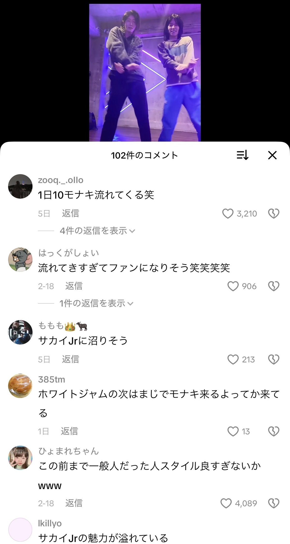 このおヨネさん、サカイJr.さん2人で出ている投稿にはこのようなコメントが集まっており、TikTok民の「コメントしやすさ」が受けている印象で、投稿にコメントが集まってくることで、アルゴリズムが作用し、またさらに伸びていくといった循環になっています。