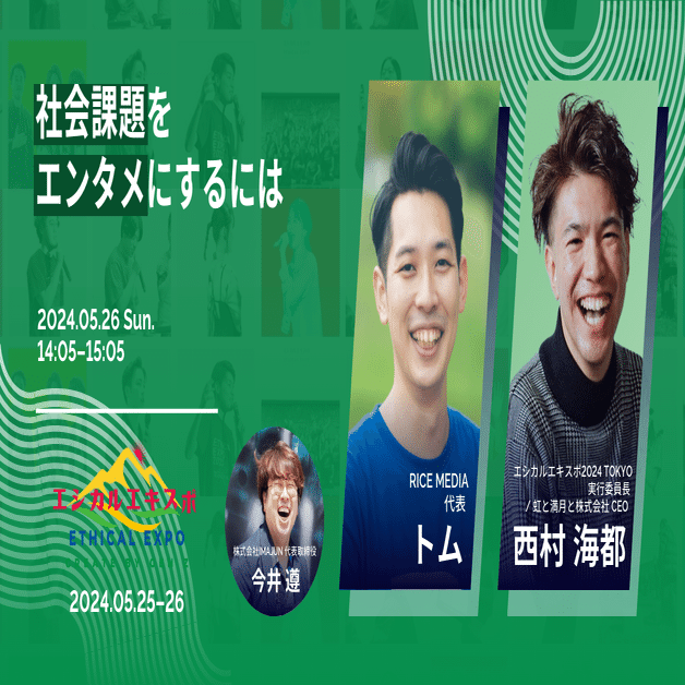 エシカルエキスポ2024 TOKYO内にて、主な視聴者層がZ世代であるRICE MEDIAを運営する、Tomoshi Bito株式会社代表のトムさんと「社会課題をエンタメにするには」というテーマでトークセッションを企画しました。